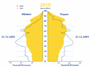 Die Entwicklung der Altersstruktur bis zum Jahr 2050 wird in der Grafik ersichtlich.